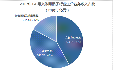 從文體用品制造業(yè)三大子行業(yè)主營業(yè)務(wù)收入分布看,文教辦公用品制造累計完成主營業(yè)務(wù)收入773.21億元(占42%);體育用品制造完成748.70億元(占41%);游藝器材及娛樂用品制造完成314.53億元(占17%)。
