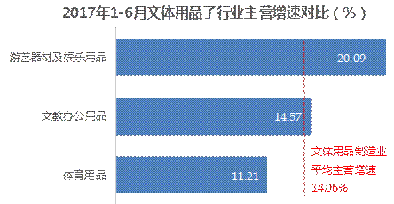 根據(jù)國家統(tǒng)計局?jǐn)?shù)據(jù)顯示,2017年1~6月,文體用品制造業(yè)規(guī)模以上企業(yè)2376家,累計完成主營業(yè)務(wù)收入1,836.44億元,同比增長14.06%,比同期輕工全行業(yè)的平均主營增速高3.03個百分點。6月份當(dāng)月完成主營業(yè)務(wù)收入372.16億元,同比增長11.84%,環(huán)比5月增長13%,達到本年前最高單月值。