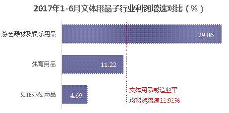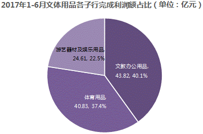 從三個子行業(yè)1-6月完成利潤情況看,文教辦公用品制造累計完成利潤總額43.8億元(占40.1%);體育用品制造完成40.8億元(占37.4%);游藝器材及娛樂用品制造完成24.6億元(占22.5%)。