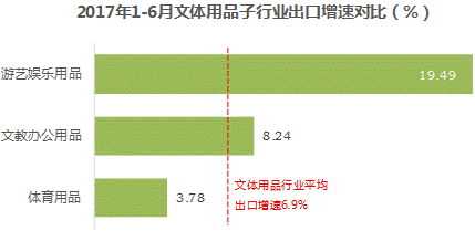 游藝娛樂用品1-6月累計出口增速大幅增長19.5%;其次文教辦公用品出口增長8.2%,體育用品出口僅增長3.8%,低于文體用品行業(yè)平均增速。